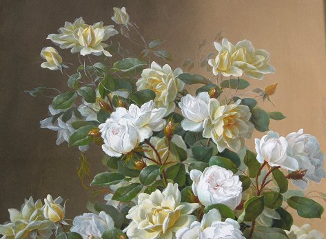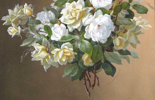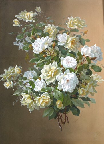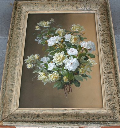 DELONGPRE, Raoul, (American, 1843-1911): White and yellow roses, W/C and Gouache, 27'' x 19'', signed lower right, encased in a carved and gessoed frame with wear with scattered areas of missing gesso along the edges, 35 1/4'' x 27 1/2''. Condition - There is very faint moisture damage in the right margin and lower right corner. Est. $8000/12000**