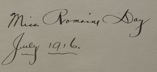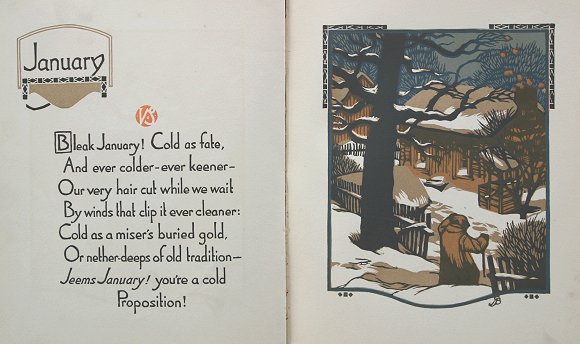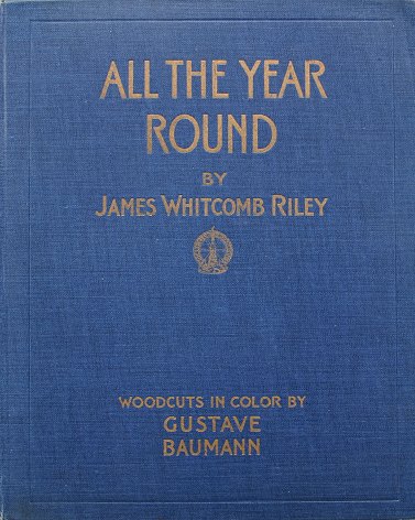 BOOK OF POEMS ''ALL YEAR ROUND'' BY JAMES WHITCOMB RILEY: 1912 edition with 12 WoodBlock prints by Gustave Baumann inserted, 10 3/4'' x 8 3/4'', signed in ink on the inside cover ''Ms.Romaine Day, July 1916. Also, included with the book is a dedication from James Whitcomb Riley to ''Fellow Rotarians'' dated June 21, 1916. Condition - Good overall, minor wear, some dirt stains.