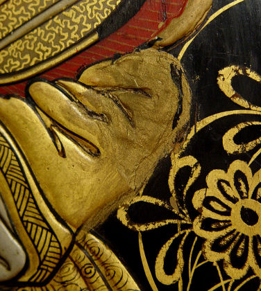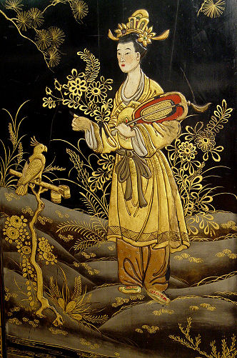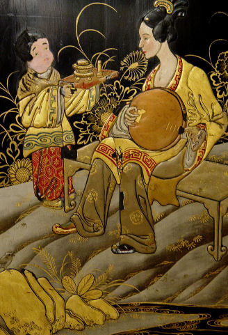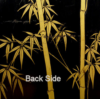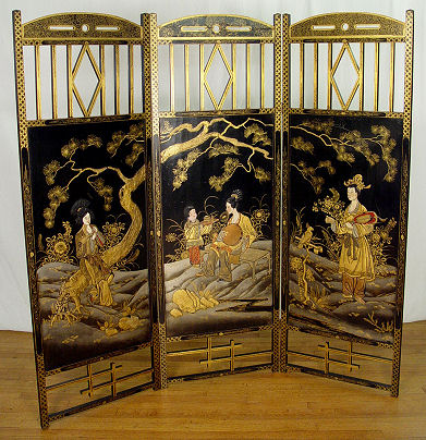 TURN OF THE CENTURY CHINESE TRI FOLD SCREEN: Heavy chinoiserie decoration on black ground. Depicts oriental figures with musical instruments, opposite side with bamboo motif, repainted and as found condition. 66'' h. x 68'' overall.