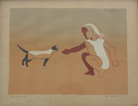 BOTHWELL, Dorr, (American, 1902-2000): ''Child Coaxing Cat'', Serigraph, 13'' x 16 1/2'', pencil signed lower right and dated '43, numbered 2 of 12, titled in pencil lower left, encased in worn vintage frame. Bothwell was a pioneering female print maker who worked with the WPA and was an important proponent of the modernist movement in California. Condition - Very mild toning throughout.