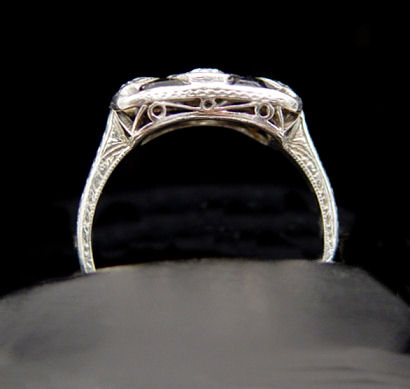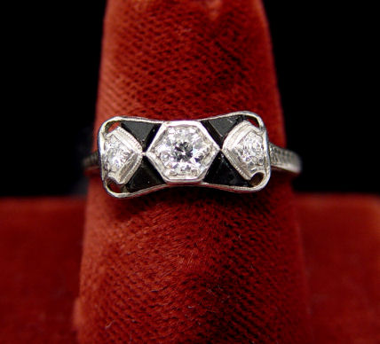 ART DECO PLATINUM & DIAMOND RING: Lovely filigree and engraved mounting of platinum set with 3 diamonds, approx. 40pts total, and triangular black onyx accents. Size 6 3/4 and approx. 4.5 grams. Est. $600/800**