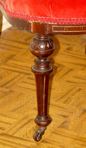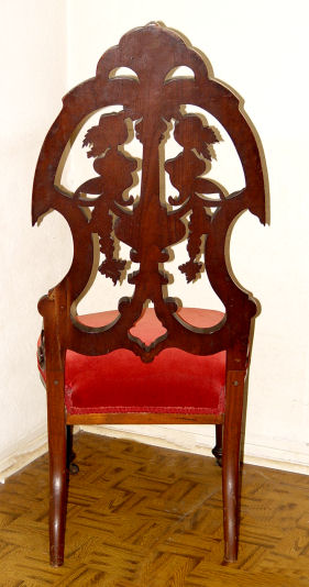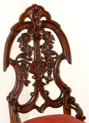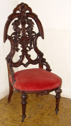 19TH C VICTORIAN MEEKS QUALITY CARVED SIDE CHAIR: Dated 1868 on the center splat, carved with grapes motif, seat height from the floor is 15'', 19 1/2'' w. x 18'' deep, overall 43 3/8'' h.