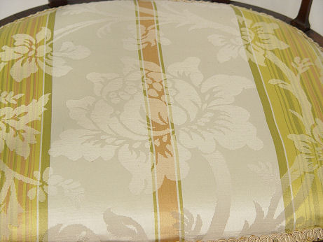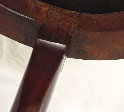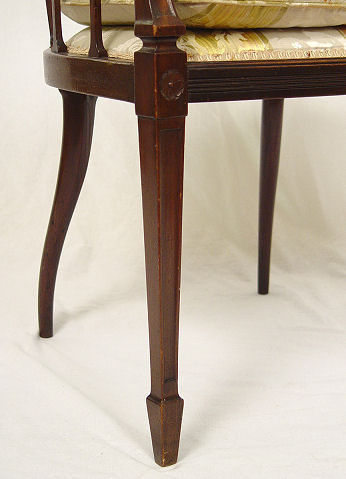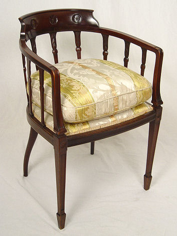 FINE MAHOGANY BOW BACK CHAIR: The low back seems to be a continuos band the arms. Note the leaf carvings on each of the spindles. Down cushion. 31''h. x 21'' x 18''.