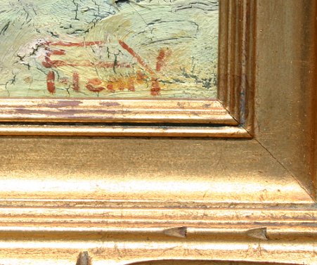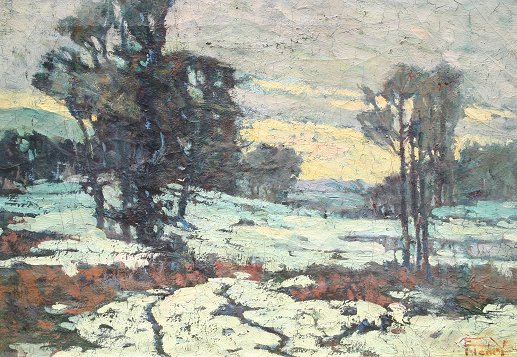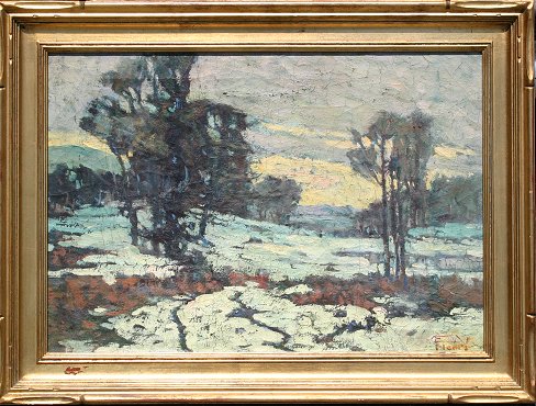 EXCEPTIONAL IMPRESSIONIST WINTER LANDSCAPE: O/C, 16'' x 23'', signed lower right E.Henry?, encased in carved and gilded frame with wear, 21'' x 28''. Condition - Very heavily applied paint, large sections of craquelure throughout, stable paint, needs cleaning.