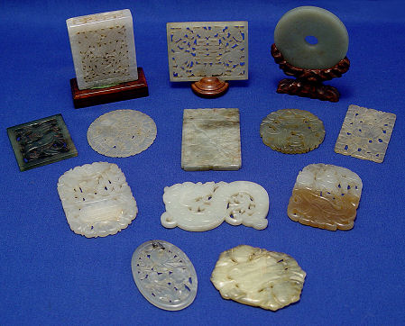 COLLECTION OF 13 CARVED JADE PLAQUES: Featuring a 1/2'' thick plaque on wooden stand. The others are 2-3''l. and 1/8-1/4'' thick. Three are on wooden stands. This is a small part of the private collection of jade we are offering in this auction.