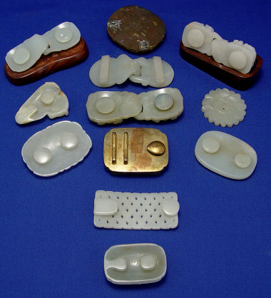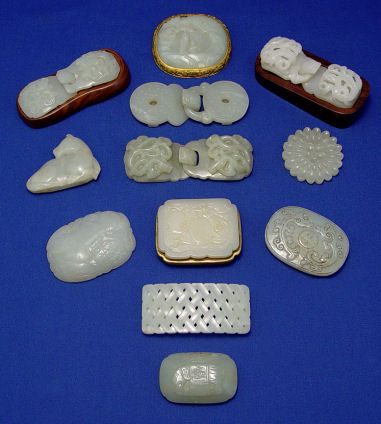 GROUP OF 12 CARVED JADE BELT CLASPS AND BUTTON: Four of the twelve are 2 part clasps, one is in the form of a horse. They range in size for the 2'' dia. button to the 4'' clasps. This is a small part of the private collection of jade we are offering in this auction.