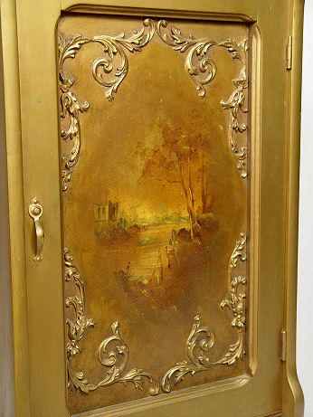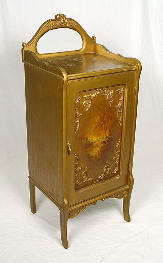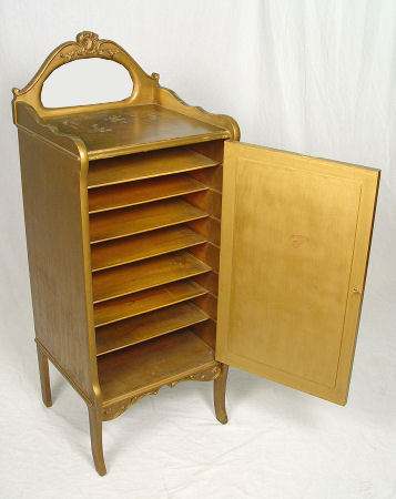 MUSIC CABINET: Original gold painted and paint decorated finish. Interior fitted with 7 pull out shelves. Beveled mirror backsplash. 45''h. x 17 1/2'' x 16 1/2''.