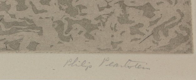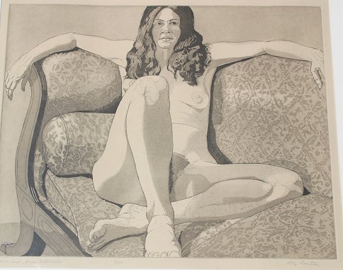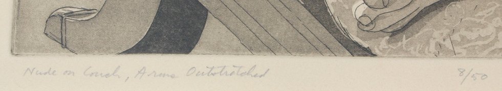 PEARLSTEIN, Phillip, (American, 1924-): ''Nude On The Couch, Arms Outstretched'', Etching, sight size with margins 19'' x 22 3/4'', pencil signed lower right, titled in pencil lower left and numbered 8/50, encased in contemporary chrome frame, 26 1/4'' x 31 1/4''.