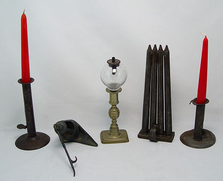 5 PIECE ESTATE COLLECTION OF EARLY LIGHTING: To include iron Betty lamp, 2 hog scraper push up candle holders ( 4 1/2 and 7 1/4''), a 10'' tin candle mold, and a double wick fluid peg lamp that fits into a brass candle holder (9''h).