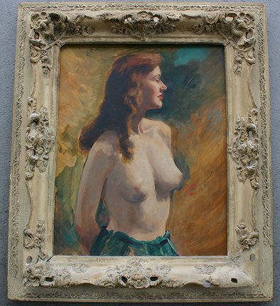 THOMPSON, Seymour, (American, 1910-1981): Young female nude, O/B, 20'' x 16'', from the artist's estate, encased in an older carved and antiqued frame with wear and missing gesso, 27 1/2'' x 23 1/2''.