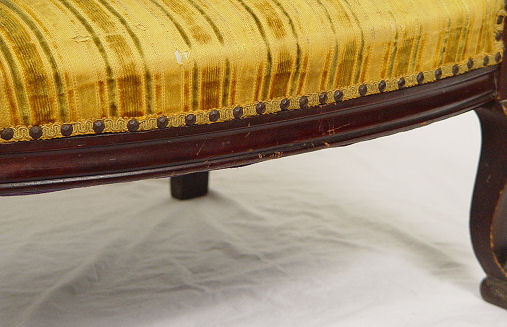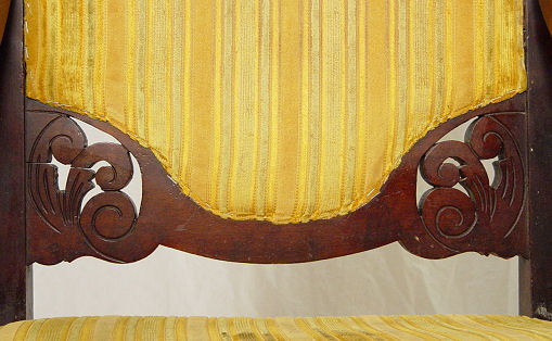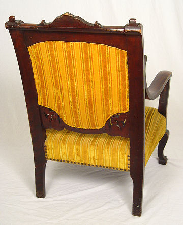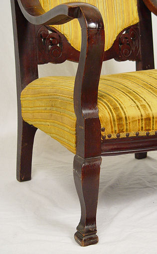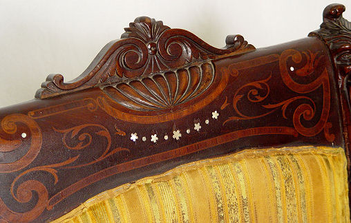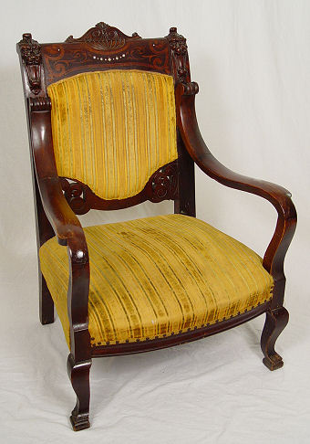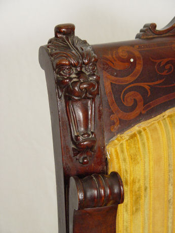 19th C CARVED LIONS HEAD CHAIR: Lions heads reign over the stiles, mother of pearl and satinwood marquetry inlay with star and dot embellishments the crest rail, masculine scrolled arms. Slightly worn condition. 39 1/2''h. x 28'' x24''.