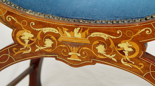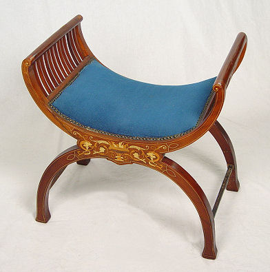 IVORY INLAID FRENCH EDWARDIAN STOOL: Conforming X shaped frame, inlaid with ivory and tulip wood. Approx. 22''h. x 22''w. Please call for condition.