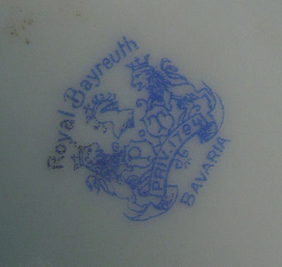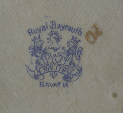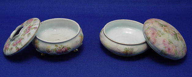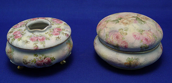 ROYAL BAYREUTH ROSE TAPESTRY HAIR RECEIVER & DRESSER JAR: Footed hair receiver, 3 3/4''h. overall, some wear to gold on edge of hole, blue stamp plus 85? on lid and 20 on base. Domed top dresser jar, approx. 3''h., blue stamp mark plus 15 to base and 35 to lid. No chips or cracks noted.