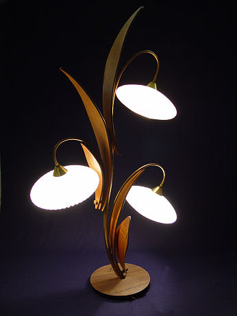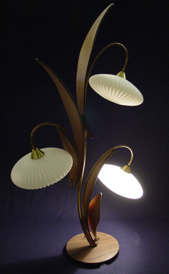 MID CENTURY MODERNE BENTWOOD LAMP: Three white glass pleated glass shades as flowers, the leaves are formed of bentwood. 52''h.