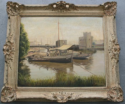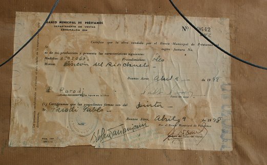 PABLO, Parodi, (Argentina, 20th C): Harbor scene, O/B, 20'' x 23 1/2'', encased in a carved and gessoed frame with minor wear and repair, 27'' x 30'', signed lower right and dated '48, label affixed verso from the Banco Municipal de Prestames.