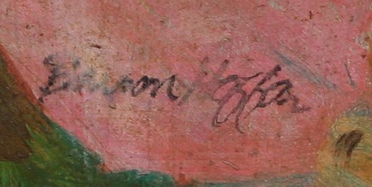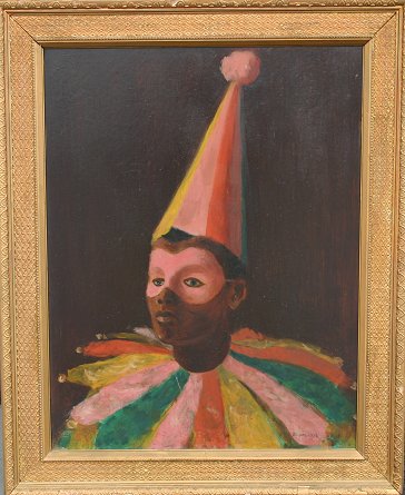 NEGRO HARLEQUIN, O/MASONITE, CIRCA 1940s: 28'' X 22'', signed lower right Barron Hoffar?, encased in later overpainted gilded gesso frame with missing gesso decor, 34 1/4'' x 28''.
