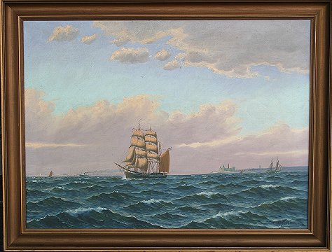 PALMER, O., (Danish, 20th C): Schooners and sailboats in a Danish harbor, O/C, 25 1/2'' x 35'', signed lower right, slightly worn gold frame, 30 1/4'' x 39 1/4''.