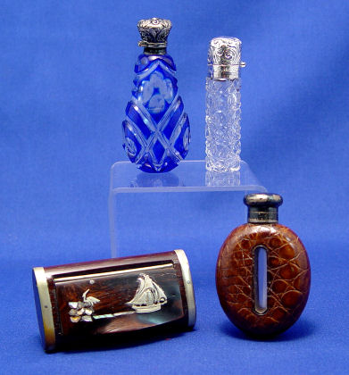 LOT OF 3 MINIATURE BOTTLES & A SNUFF BOX: To include, miniature oval flask covered reptile skin with sterling top and internal glass stopper, marked SM lion passant leopard head and O all in shields London 1889?, approx. 3''; cut glass scent bottle with silver hinged lid and internal glass stopper, silver marked Birmingham 1902, 3''; blue cut to clear glass scent bottle, no stopper, no mark to repousse unhinged top with small hole, 3 1/4''; and a wooden snuff? box with hinged lid inlaid with mother of pearl rocks by water and silver ship and bird, 3 1/8'' x 1 5/8''. Sold as a lot.