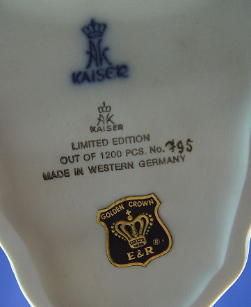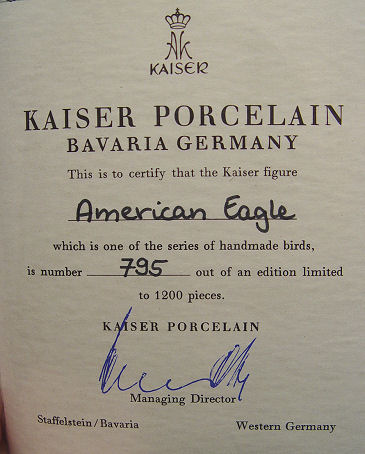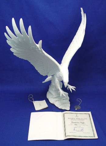 A LARGE KAISER GERMAN PORCELAIN AMERICAN EAGLE: Limited edition #795 of only 1200. All pure white Parian porcelain, 16 3/4''h, 16'' wing span. Modeler U. Netzsch. Includes certificate and original labels. Excellent condition.