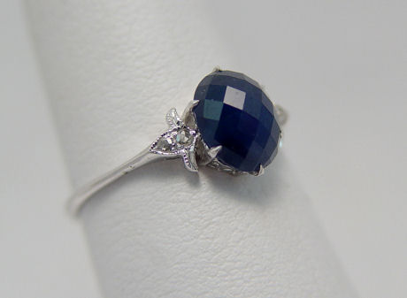 DELICATE BRIOLETTE CUT SAPPHIRE RING: Vibrant sapphire of approx. 1.5ct set in 14k white gold, accented on shoulders with tiny fleur de lis set with diamonds, size 6 1/4.