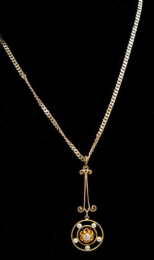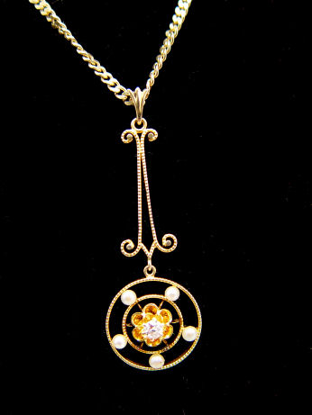 DIAMOND AND PEARL FILIGREE PENDANT: Delicate openwork pendant centered by a 10pt diamond with seed pearl accents, 1 7/8''l. Currently on a 24'' chain of 14k yellow gold. Overall 9.5 grams.