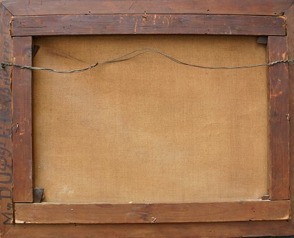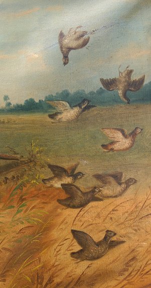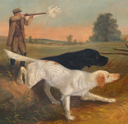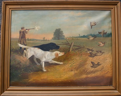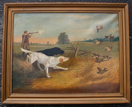 PRIMITIVE/FOLK ART 19TH CENTURY HUNT SCENE: Depicting a hunter with his dogs flushing game from the brush, dogs are probably labrador and setter or pointer and bird probably pheasants or grouse, O/C, 18'' x 24'', no visible signature, encased in an overpainted liner of the period, 21 1/4'' x 26 3/4''. Condition - Needs cleaning, several abrasions with minor flecks throughout, several small punctures.