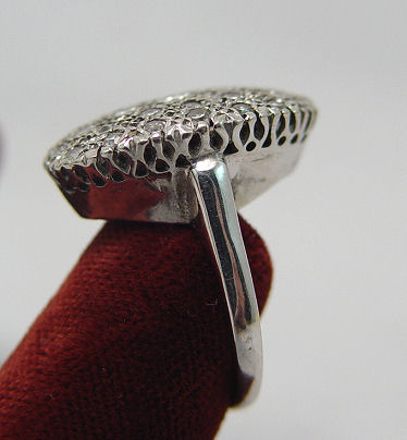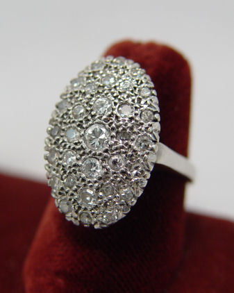LADY'S DIAMOND DINNER RING: This 14k white gold ring has an oval top pave set with approx. 1ct total of diamonds. Three full cut stones and 29 single cut diamonds. Size 6 1/2, 7.5grams.