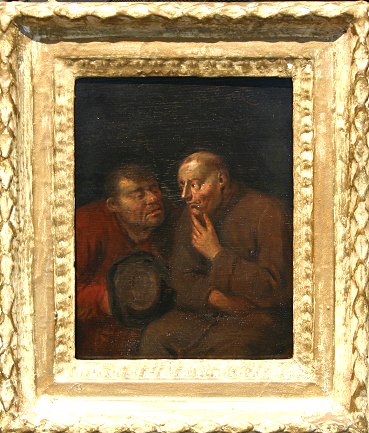 HEEMSKERCK, Egbert Van(the elder), (Dutch, 1610-1680),(Attribution): ''Seeking Advice'' depicts a peasant man consulting a monk, O/Chamfered Oak Panel, 6 1/4'' x 5'', encased in a very old frame, possibly period frame with overpaint, 8 1/2'' x 7 1/8'', incised inventory number possibly a private collection or museum inventory code. Condition - Worn but fairly good overall, no in-paint or touch-ups.