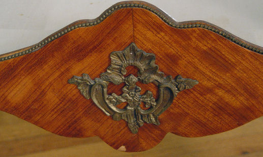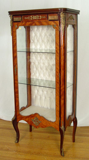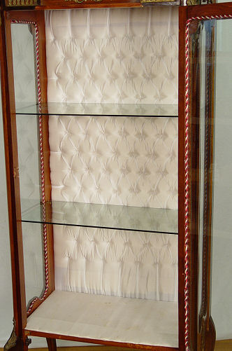 BEAUTIFUL FRENCH CURIO: Beautiful French curio made of flame grain mahogany wood with white satin tufted interior. Ormolu decorations on top and bottom with 2 glass shelves. Measures approx. 5'3/4'' x 251/4'' w x 15'' depth.