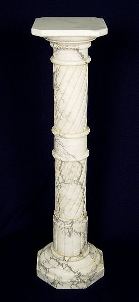 WHITE MARBLE PEDESTAL: Veined with gray. The top is octagonal, the column is carved spiral, 39 1/2''h.