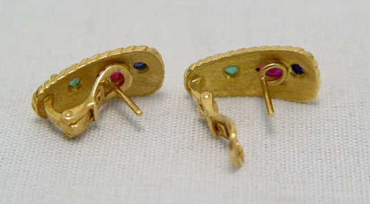 ETRUSCAN STYLE 18K GOLD EARRINGS: Scroll covered tabs of 18k yellow gold bezel set with pear shaped rubies and round cut emeralds & sapphires. Omega backs, marked 750, a tad less than 3/4''l., 4.5 grams.