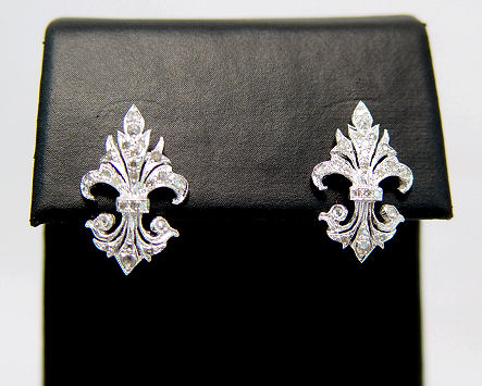 FLEUR DE LIS DIAMOND EARRINGS: Lovely post earrings of 14k white gold in the shape of fleur de lis set with 24 single cut diamonds and 24 old cut diamonds, approx. 35pts total, approx. 3/4''l. Est. $400/600**