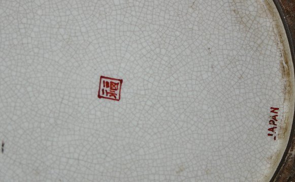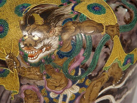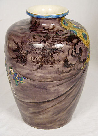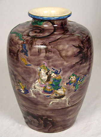 JAPANESE SATSUMA EARTHENWARE VASE: Story scene of beast in pursuit of horse and figures. Background scene under glaze, purple ground. 16''h.