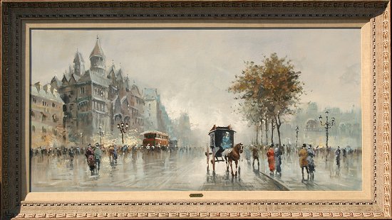 DEVITY, Antonio, (Italian, 1901-): Parisian street scene, O/C, 24'' x 48'', signed lower right, Devity Art Studio stencil on the canvas verso, encased in carved white washed frame, 31'' x 55''.