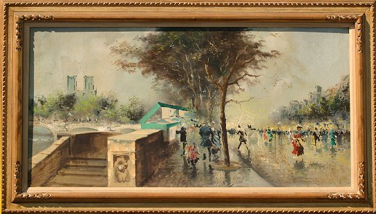 DEVITY, Antonio, (Italian, 1901-): Parisian street scene with outdoor market, O/C, 24'' x 48'', faintly signed lower right, encased in carved gold frame, 32 1/2'' x 56 1/2''.
