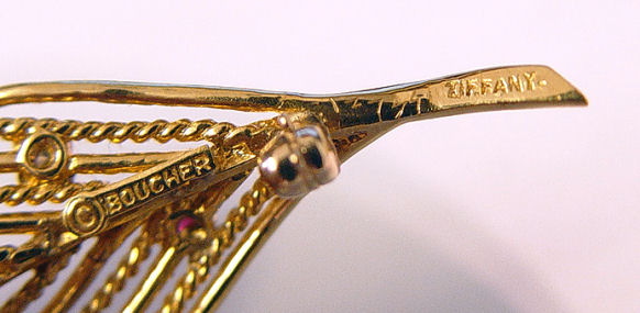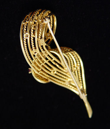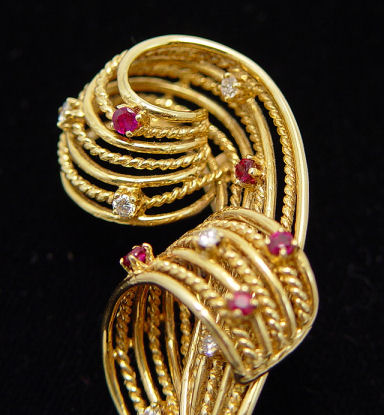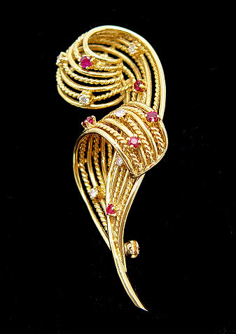 BOUCHER TIFFANY, 18K GOLD PLUME PIN W/RUBIES & DIAMONDS: Lyrical 18k yellow gold pin scattered with tiny diamonds and rubies, alternating smooth and twisted bands of gold, marked verso 18k Boucher Tiffany, 2 1/4''l., 12 grams.