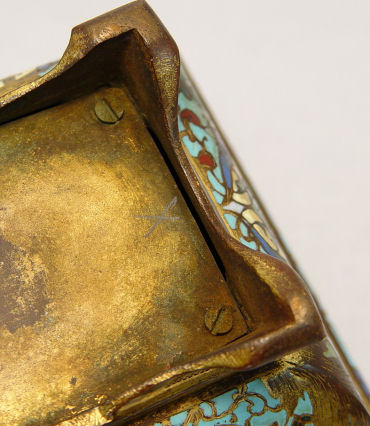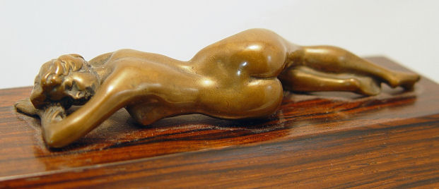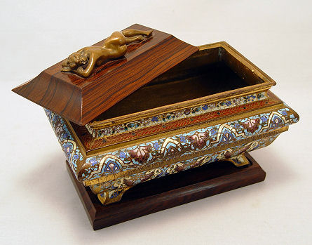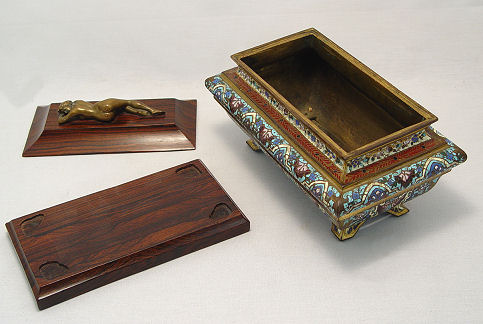 CHAMPLEVE BOX SURMOUNTED WITH BRONZE NUDE: Sarcophagus shaped box, wooden lid with 4 1/2'' bronze nude reclining across the top. 7''h. including wooden stand, 9''l, x 5 1/2''.