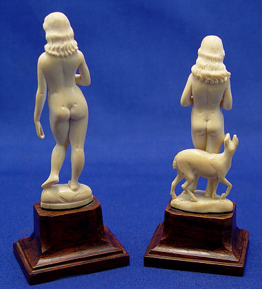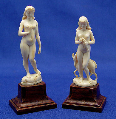 TWO MINIATURE CARVED IVORY NUDE FIGURES: European carved figures, 3 1/4'' and 3 1/2''h., each mounted on a wooden base.