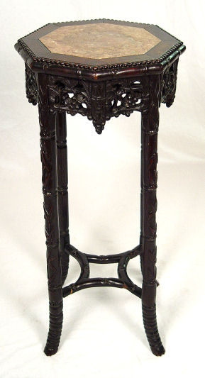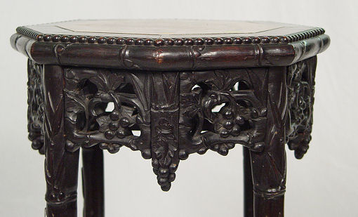 CARVED CHINESE STAND: Marble insert in a stand carved in a berry and bamboo motif. 32''h. x 14 1/2''dia.