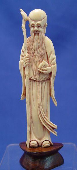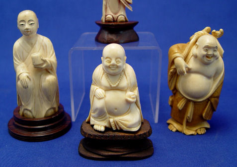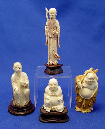 4 CHINESE CARVED IVORY FIGURES: 1) Traveling standing Buddha, 3 3/4''h., signed on underside 2) Sitting Buddha with age separations, 2 3/4''h 3) Buddhist priest, 3 5/8'' 4) Elder with staph, 5''h.
