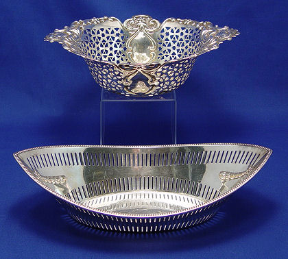 LOT OF 2 RETICULATED SILVER PLATED BASKETS: To include, Walker & Hall Sheffield 61457, flower and star pattern with scrolling supports and masqueron handles, 10 3/4'' x 8'' x 3 1/4''; & a WMF pointed oval basket with straight cuts and floral swag decorations, 12 1/2'' x 6 1/4'' x 3 1/2''h.