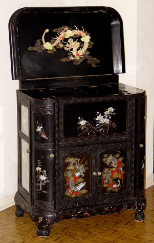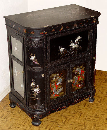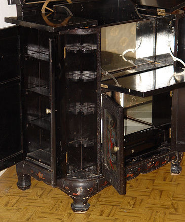 CHINESE BLACK LACQUER BAR WITH MOTHER OF PEARL INLAY: Lift top raises to reveal full bodied dragon guarding your libations, split interior top connected to the bottle rack and elevate when opened. Side doors open to reveal shelving and corners swing back for storage of 8 stems. Center front with upper drop down and lower storage with single drawer, mirrors abound. Approx. 30 3/4''w x 36 3/4''h x 18''d.