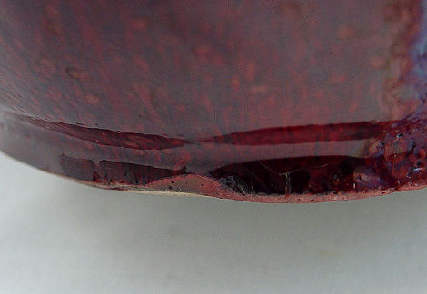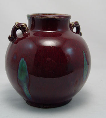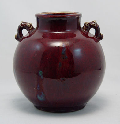CHINESE SANG DE BOEF OXBLOOD GLAZE VASE: Ball vase with elephant head handles, 7 1/2''h.