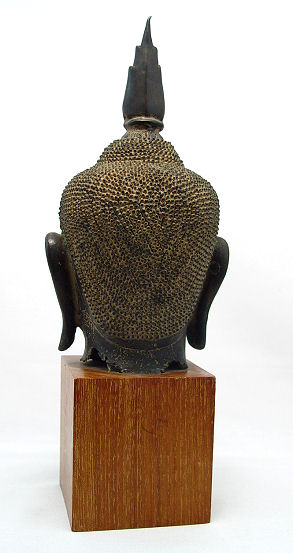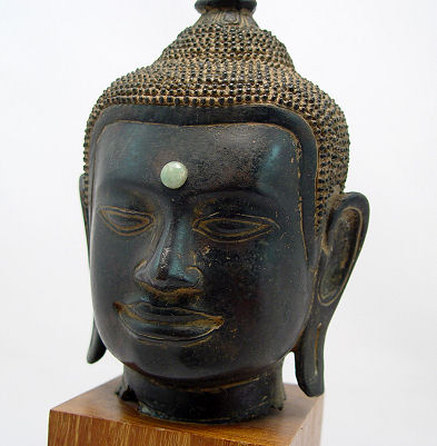 BRONZE HEAD OF BUDDHA: Fragment of a statue, mounted on a wood block. The bronze is 10''h., the wood block is 4''h.