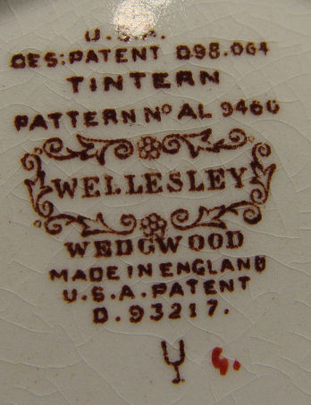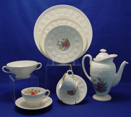 WEDGWOOD TINTERN CHINA SERVICE: To include 12 dinner plates 11'' dia., 12 salad plates, 12 bread plates, 12 cream soups with underplates, 11 demi coffee cups, 8 cups & saucers and a coffee pot. Please note some discoloration.