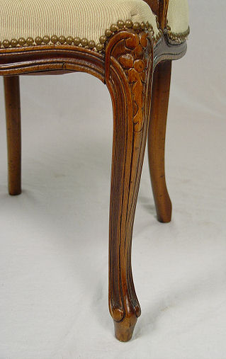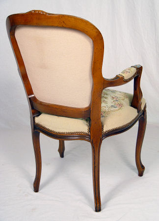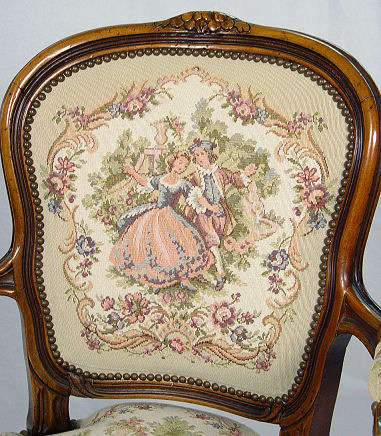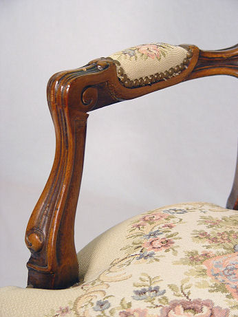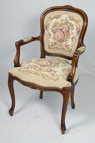 ITALIAN CARVED WALNUT OPEN ARM CHAIR: Made by Chateau d'Ax, Milan Italy. Tapestry fabric seat and back. 38''h. 30''w. Later 20th C. Est. $200/300**