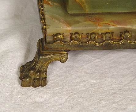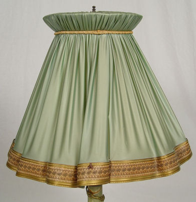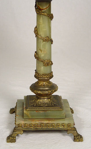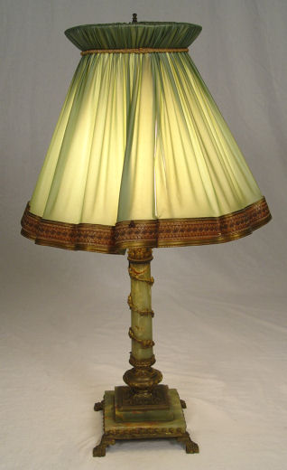 GREEN ONYX & ORMOLU LAMP: Lovely column of green onyx wrapped & supported by ormolu, strange soft plastic shade appears like fabric and matches colors perfectly, 16''base, 29 1/2''h. overall.