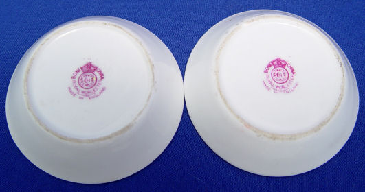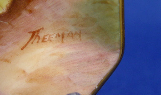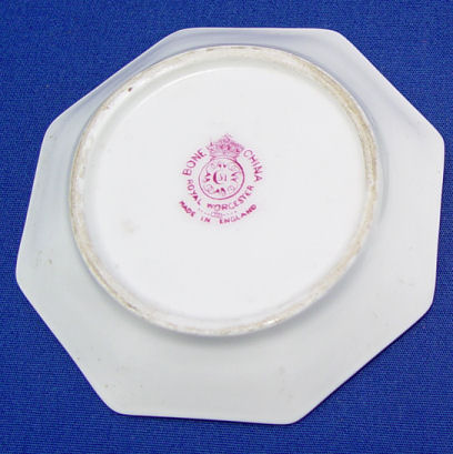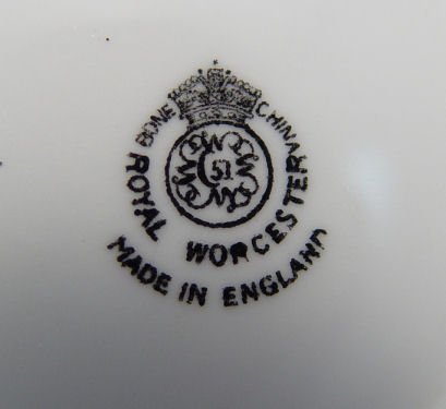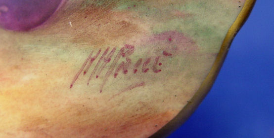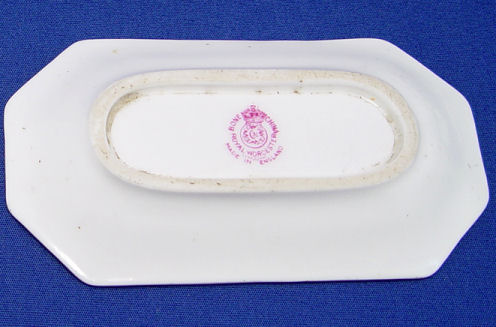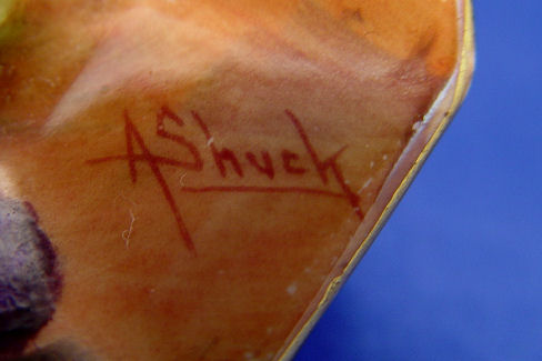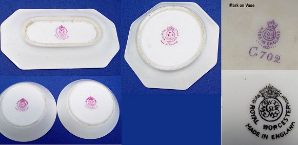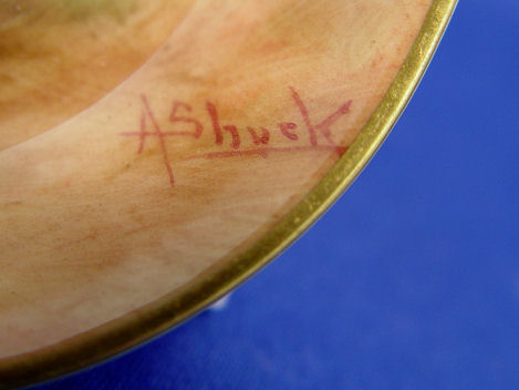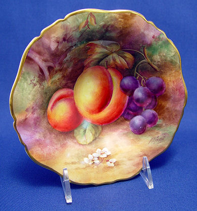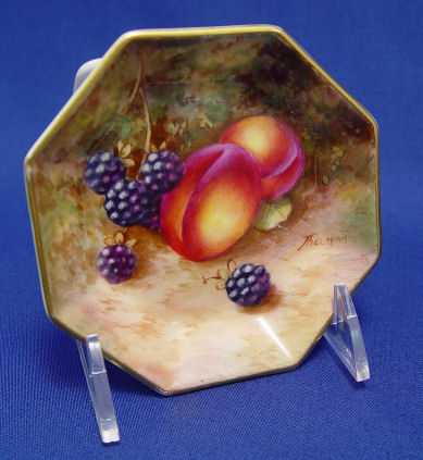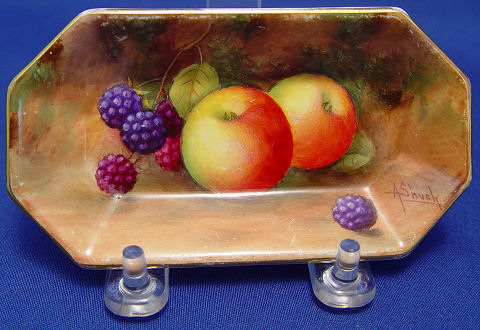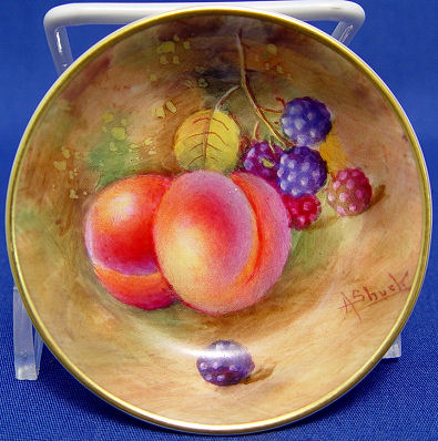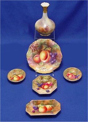 LOT OF 6 HAND PAINTED ROYAL WORCESTER PORCELAINS: 5 in a fruit motif, to include, 3 signed A Shuck, two small round dishes 2 3/4'' and one canted corner rectangular dish 4 1/2'' (note wear to edges); an octagonal dish signed Theeman, 3 1/2''; a pedestaled bowl signed HH Price, 5 1/4''; and an adorable bottle neck vase painted in a landscape with Scottish cattle, signed Stinson, 5 1/4''h. All pieces with gold trim.