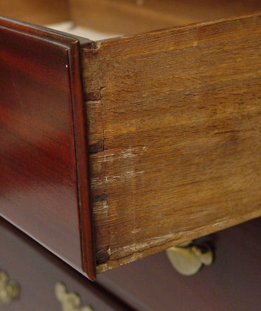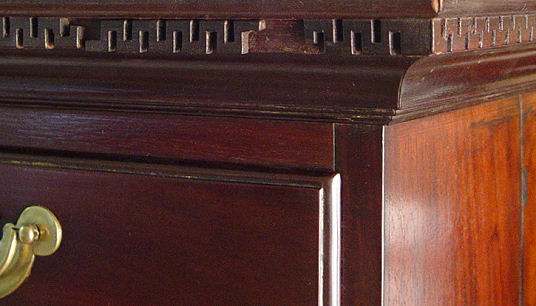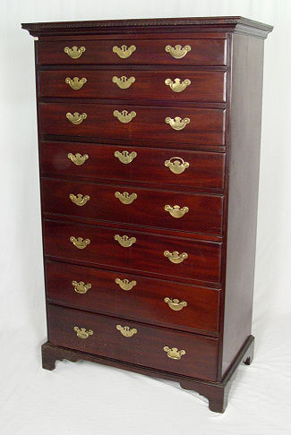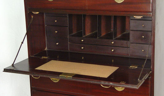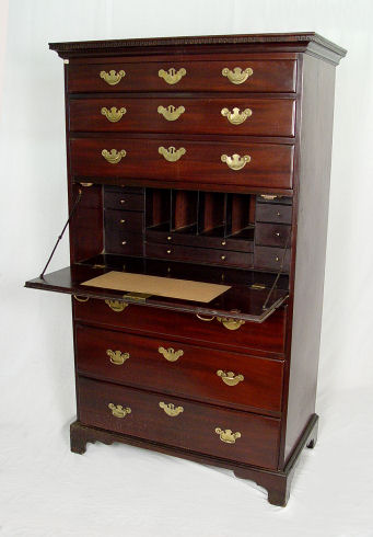 18TH C. IRISH MAHOGANY SECRETARY CHEST: Appears to be a tall chest with eight graduating drawers, the fourth and fifth are in reality the fall front desk behind which is a felt writing surface, pigeon holes and drawers. Dentil molding around the top. Plank board back. 62 1/2'' X 37'' X 20''.