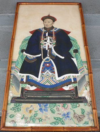 19TH CENTURY ORIENTAL ANCESTRAL PORTRAIT OF ROYALTY?: W/C, Gouache and Pencil, 42 1/2'' x 22'', encased in applied bamboo frame, 44 1/2'' x 24'' with minor wear.